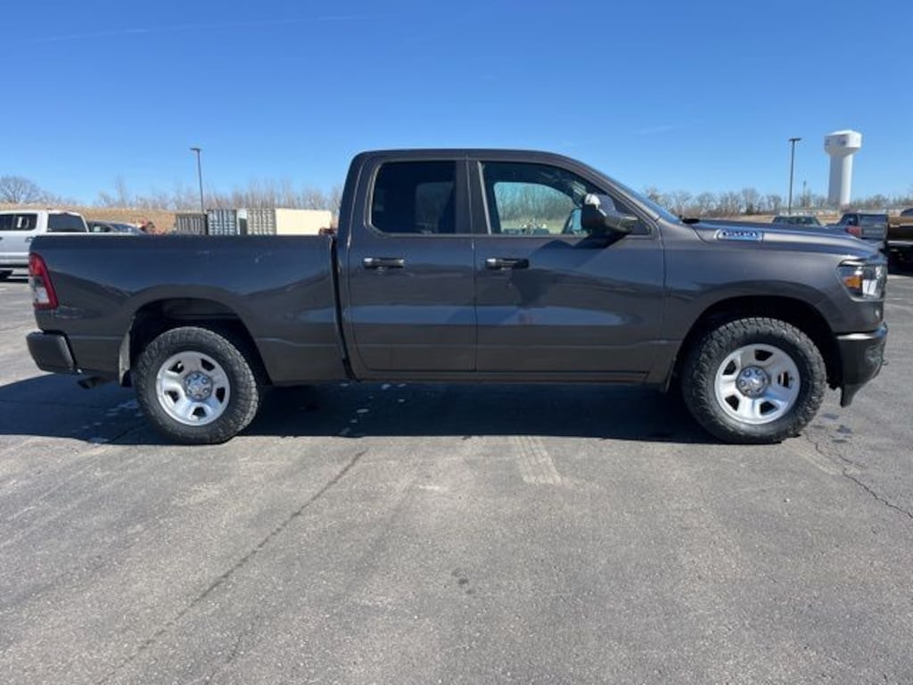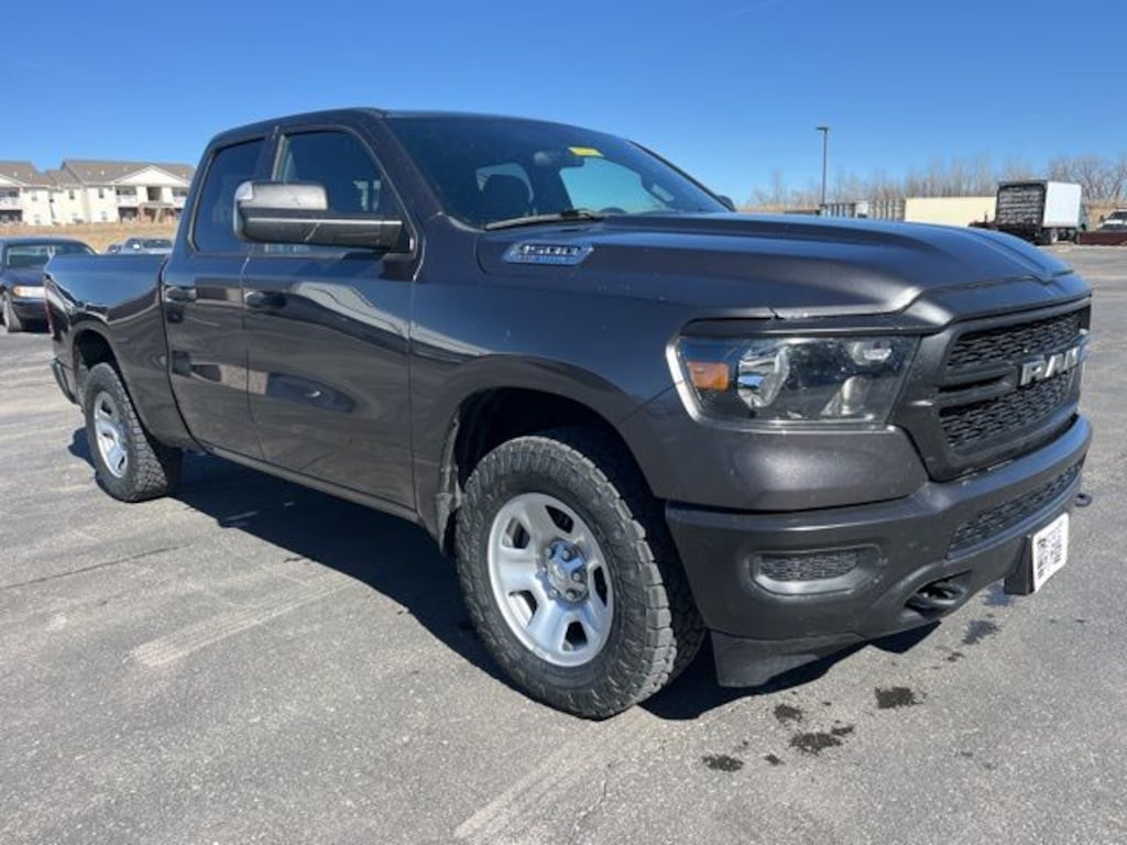 Our One Owner, Accident-Free 2024 RAM 1500 Tradesman Quad Cab 4X4 in Granite Crystal Metallic is a skilled worker that doesn't back down from big jobs! Motivated by a 5.7 Liter eTorque HEMI V8 delivering 395hp matched to an 8 Speed Automatic transmission for strength and capability owners love. This Four Wheel Drive truck is also ready to tow right out of the box, thanks to a standard Class III bumper hitch, and it achieves nearly 22mpg on the highway. Our RAM 1500 pulls ahead of the pack in style with quad halogen headlights, an LED tailgate-handle hitch light, black bumpers, a matching grille, and heated power mirrors.